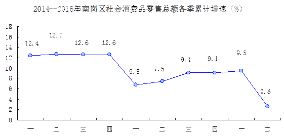 3、消费品市场增速回落明显。上半年,南岗区累计实现社会消费品零售总额471.5亿元,同比增长2.6%。总量占全省的12.5%,占全市的28.3%,占九区的34.0%;增速分别低于全省和全市7.4个和7.7个百分点,增速比今年一季度回落6.9个百分点,比上年同期回落4.9个百分点。